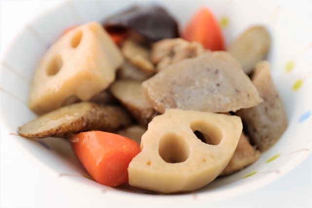 All the ingredients are stir-fried, and chicken is added to a pot of boiled soy sauce, sweet sake, and sake, followed by ingredients such as carrots, lotus root, and burdock in order. After everything has been colored, add taro and simmer until the vegetables are tender and the liquid has evaporated to complete the dish.