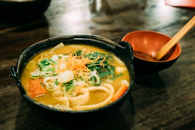 Houtou is a local dish in Yamanashi Prefecture. Thick and short noodles made from wheat flour are stewed in a miso-based soup with ingredients like pumpkin. The thickness of the noodles and the ingredients can vary depending on the region.