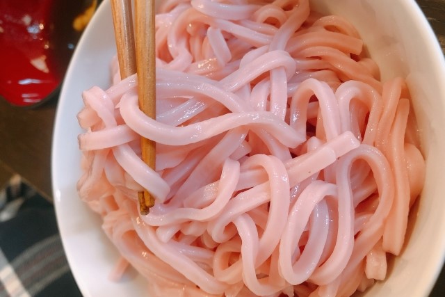 Ume Udon is a unique type of Udon native to Wakayama Prefecture in the Kansai region. Wakayama is one of Japan’s top producers of plums, which inspired a local noodle factory established in 1950 to develop these Udon noodles using plums, hence their pink color. The distinctive characteristics of this Udon include its smooth texture, firm bite, and a broth containing plum pulp.