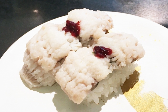 강력한 독을 가진 복어는 조리에 면허가 필요할 정도로 위험한 물고기입니다. 그러나 매우 맛있습니다. 특히 일본의 어치, 큐슈 지역에서는 인기가 많습니다. 보통은 찌개나 회로 먹지만, 삼합초밥으로 먹을 수도 있습니다.