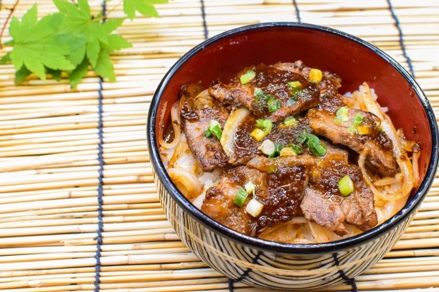 牛肉丼就是將薄切的牛肉和洋蔥以醬油為基底的甜辣調味料燜煮,然後放在飯上。據說這是在1899年,由大型牛肉丼連鎖店”吉野家”的創辦人松田英吉發明的。自1973年起,隨著吉野家全國的擴張,牛肉丼的人氣也逐漸提升,成為了平民的快餐。不僅”吉野家”,像”すき家”和”松屋”等其他大型連鎖店也提供了各自特色的牛肉丼。