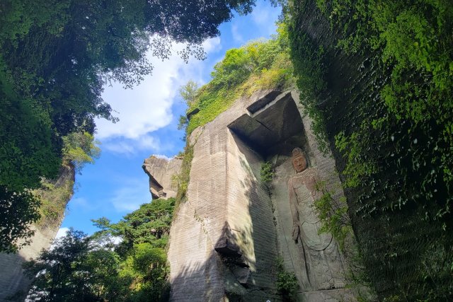 Established approximately 1300 years ago upon an imperial edict, Nihonji is the oldest temple in the Kanto region. The vast grounds are known for their long stone steps, totaling 2,639 steps made from “Mikageishi” stone, and host many historical and beautiful Buddha statues and carvings. From the summit of Nokogiriyama and the observatory known as “Jigoku Nozoki” (Peek at Hell), one can enjoy panoramic views of Tokyo Bay, the Boso Peninsula, and Mt. Fuji. The autumn leaves and the New Year’s sunrise are particularly breathtaking.