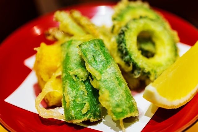 Various vegetables and root vegetables, including pumpkin, asparagus, eggplant, bitter melon, sweet potatoes, and lotus root, are also used for tempura.