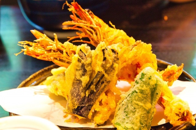 Various vegetables and root vegetables, including pumpkin, asparagus, eggplant, bitter melon, sweet potatoes, and lotus root, are also used for tempura.