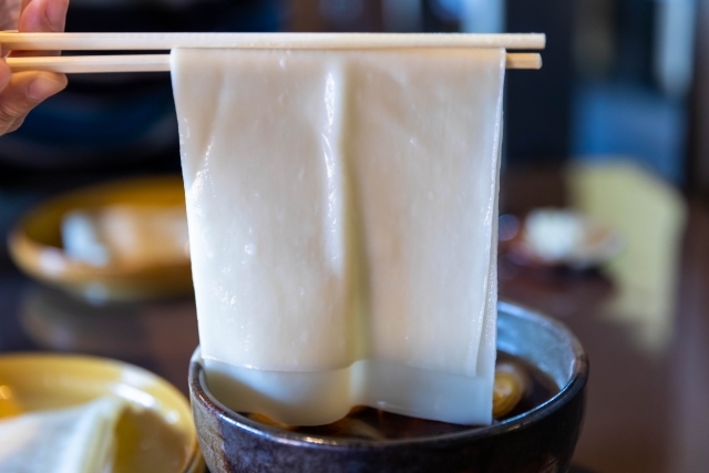 Himokawa Udon, originating from Gunma Prefecture in the Kanto region, is characterized by its flat noodles. The width of the noodles ranges from 5mm to over 15cm. Compared to typical Udon, it has a softer texture.