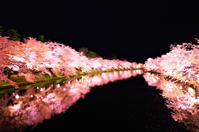 毎年4月下旬から5月上旬にかけて開催される弘前さくら祭では、国内、海外から約200万人が弘前公園に集まります。最大の見どころは花筏(はないかだ)です。桜が散り始めると、公園の外濠の水面がピンク色の花びらで覆われます。まるでピンクの絨毯が敷かれたような、圧巻の美しさが広がっています。一度は訪れて見る価値があります。
