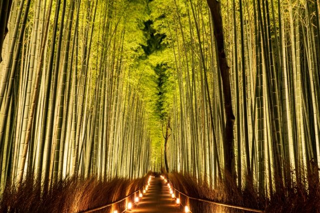 嵐山の渡月橋と同じくらい有名なのが、竹林の道です。野宮神社から天龍寺、大河内山荘庭園にかけての竹林は、見る人を圧倒します。特に秋には、竹と紅葉が美しいコラボレーションを見せます。着物や浴衣を借りて人力車での散策もおすすめです。
