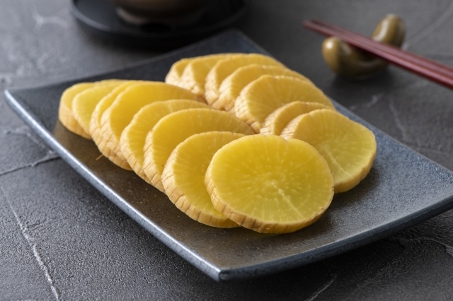 타쿠안은 무를 절인 후, 햇볕에 말린 후 누카(쌀누카나 고배 등)와 함께 숙성시킨 절임입니다. 단맛과 식감이 있으며, 상큼한 맛이 특징입니다.
