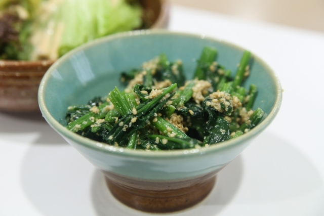 시금치의 깨소스 조림은 풍미가 풍부하고 추운 계절에 특히 맛있는 일본 요리 중 하나입니다. 시금치를 뜨거운 물에 잠시 데친 후, 찬물에 식히고, 꼭 짜서 물기를 뺍니다. 찧은 깨와 설탕, 간장을 섞어 완성합니다.