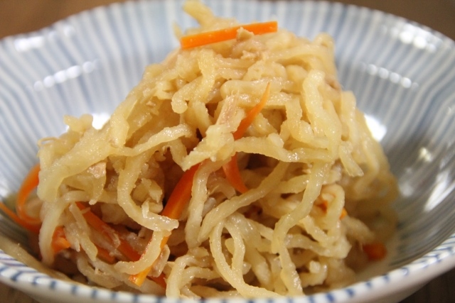 건무늬무는 무를 길게 썰어 말린 것으로, 서부 일본에서는 센기리 다이콘(Sengiri Daikon)이라고도 불립니다. 가을 끝부터 겨울에 수확한 무를 사용합니다.