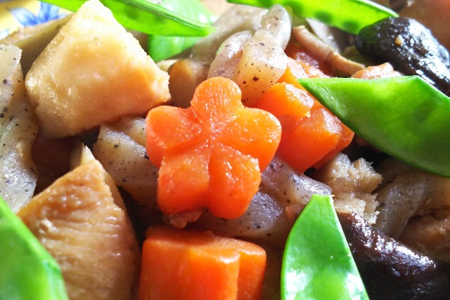 재료를 모두 볶은 후, 간장, 미림, 쌀주로 끓인 냄비에 닭고기를 넣고, 당근, 연근, 우엉 등을 차례대로 넣어서 끓입니다. 전체가 물들인 후에는 고구마를 넣고, 채소가 부드러워질 때까지 끓여서 수분을 날려 완성합니다.