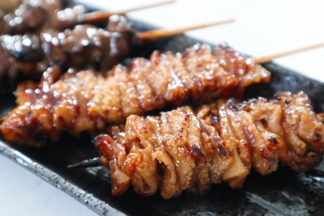 가와는 닭의 목 주위의 피부를 꼬치에 꿰어 구운 것입니다. 주로 지방으로 이루어져 있어 칼로리는 높지만, 콜라겐이 풍부하고 부드러운 식감이 특징입니다.