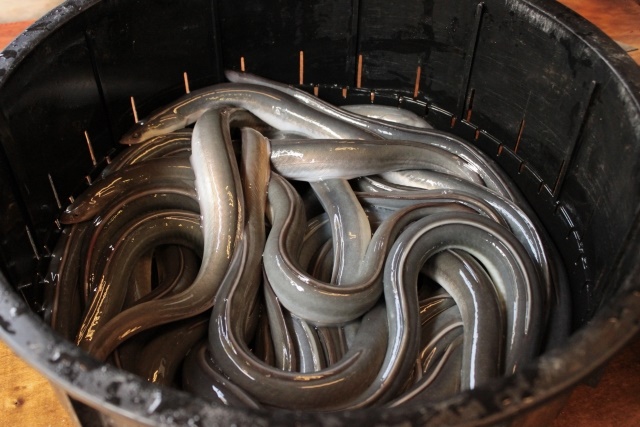 오래전부터 일본의 식탁을 장식해온 이 물고기는 현재 99%가 양식되고 있습니다. 어린 물고기는 적도 근처의 심해에서 태어나 해류를 타고 일본의 강에서 성장합니다. 여기서 성장한 어린 물고기를 못으로 옮겨서 키우며, 그런 물고기가 시장에 나옵니다. 달콤짭짤한 소스를 바르고 구운 우나기는 일반적이며, 우나기의 피에는 독이 들어 있기 때문에 스시로 먹을 때도 구운 것을 사용합니다.