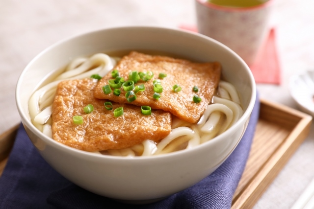 튀김을 달콤하게 끓여 올린 우동. 일본에서는 옛날부터 여우를 신으로 숭배하는 문화가 있으며 그 여우의 좋아하는 음식이 튀김이라고 합니다.