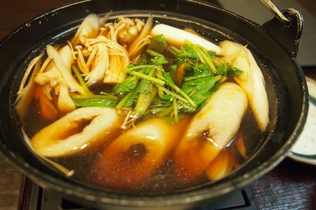 きりたんぽは、東北地方の秋田県の郷土料理です。棒状にした餅を焼き、その後、棒から外し、鶏肉と一緒に鶏ガラスープで煮込んで食べます。鶏肉には秋田県特産の比内地鶏がよく用いられます。この料理はもともと猟師の間で食べられていたと言われています。
