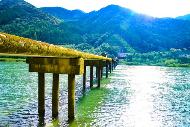 沈下橋とは、増水時に橋が水面下に沈んだ場合、流木や土砂で堰き止められないように欄干がない橋のことです。この構造によって橋の破壊や洪水を防ぎます。