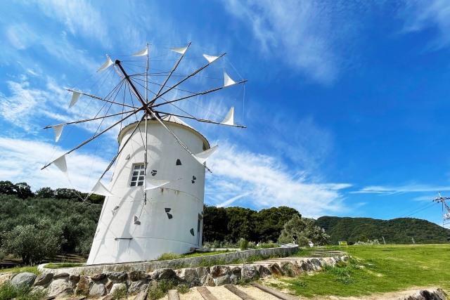 小豆島のオリーブ公園は映画「魔女の宅急便」の撮影地で、無料で「魔法のほうき」を借りて、飛んでいるような写真を撮ることができます。特に前方向にジャンプすると良い写真になります。公園の主要なスポットは風車の丘ですが、オリーブ畑の中には他の観光スポットも点在しています。