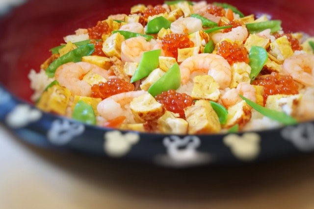 散壽司是將海鮮、炒蛋、紅蘿蔔、竹筍、香菇等各種配料混入醋飯中的一種壽司。在3月3日的雛祭兒時,有食用散壽司的習慣。