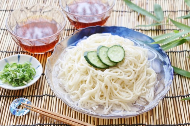 素麵是以小麥粉為原料的麵條,粗度在直徑1.3mm以下的乾麵。用青竹把水和素麵流出來,然後用筷子接住,蘸醬吃掉的”流水素麵”已經成為了夏季的風俗。