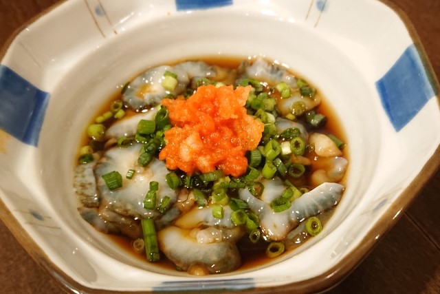 這是一道將切碎的新鮮章魚與山葵、日本酒、調味料醃製的菜品,其獨特的口感配上山葵的辛辣味道是和酒絕配。
