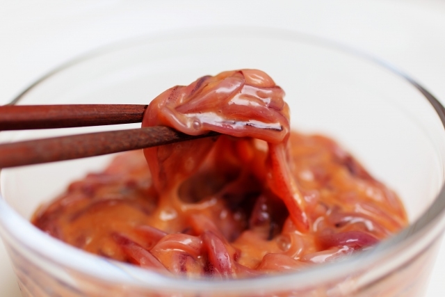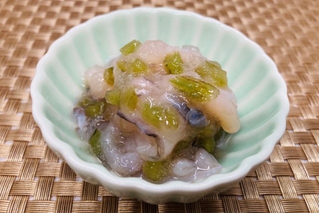 这是将煮熟的章鱼、黄瓜、裙带菜用盐和醋拌制的菜品。味道清爽,特别适合在炎热的夏天享用。