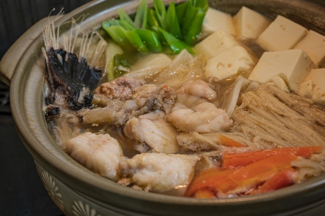 河豚锅是西日本山口县和九州地方福冈县的名菜。这种鱼有毒,因此必须由持有许可证的厨师烹饪。白色的淡淡的味道和有弹性的口感是它的特点。河豚的旺季是从11月到3月。