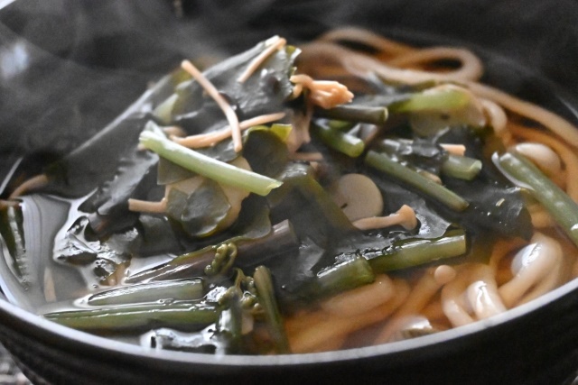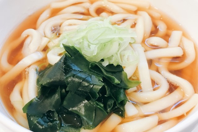 裙带菜乌冬面是在乌冬面上放裙带菜的一道菜。裙带菜是日本最常见的海藻,富含食物纤维和矿物质。