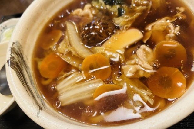 浓汁乌冬面是东北地区岩手县的地方美食。为了抵挡严寒的冬天,这种乌冬面上浇上了温热的浓汁。浓汁是以高汤和酱油为基础的汤汁,配料包括香菇、煮鸡蛋等。