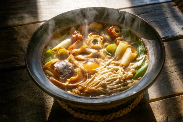 味噌煮乌冬面是中部地方的爱知县食用的著名地方菜。虽然全日本都有味噌煮乌冬面这道地方菜,但爱知县食用的味噌煮乌冬面所用的是完全用豆制成的”豆味噌”。这种味噌和鲣鱼高汤的搭配使得口感十分浓郁。此外,制面时不使用盐的做法也是其特色。